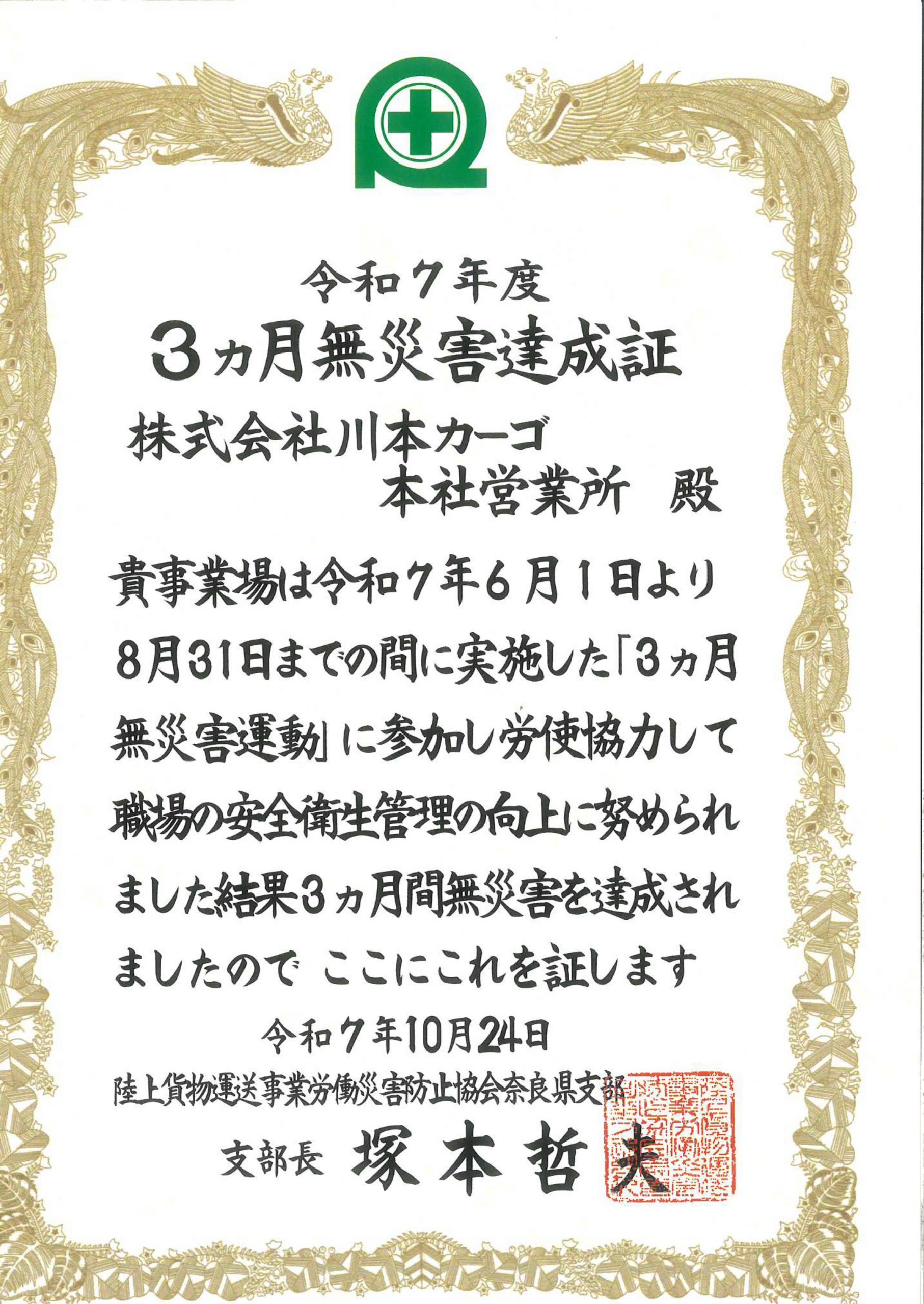 令和7年6月1日より8月31日まで、陸災防奈良県支部様主催の「3ヶ月無災害運動」で3ヶ月無災害を達成いたしました